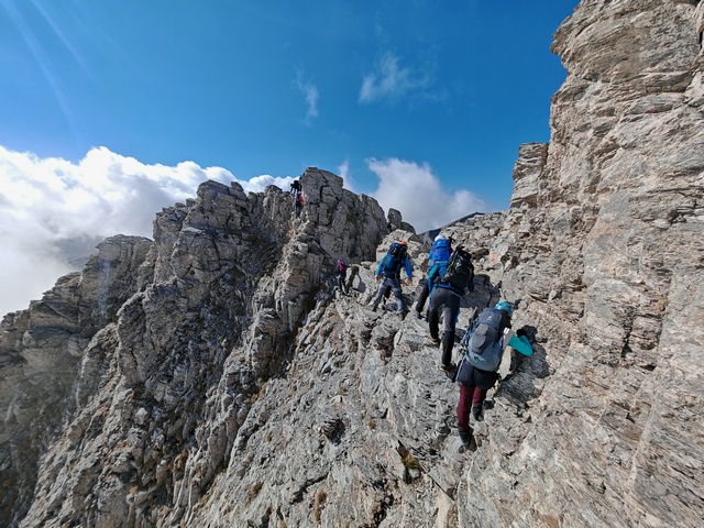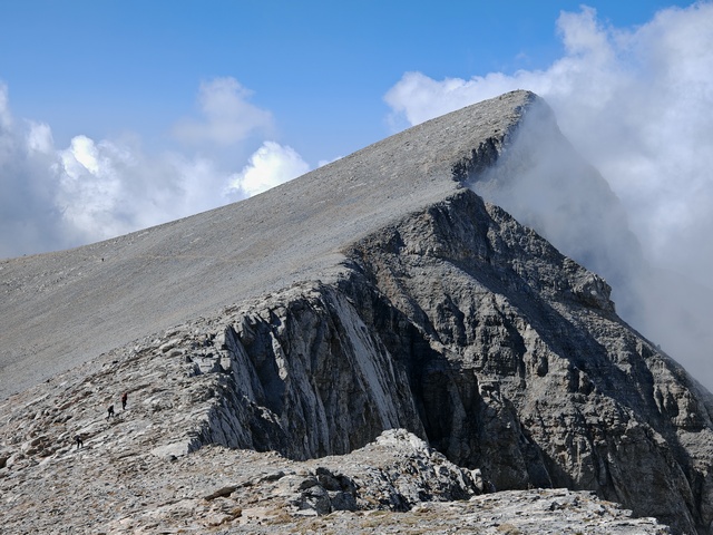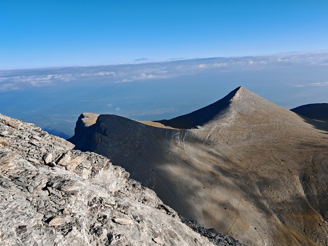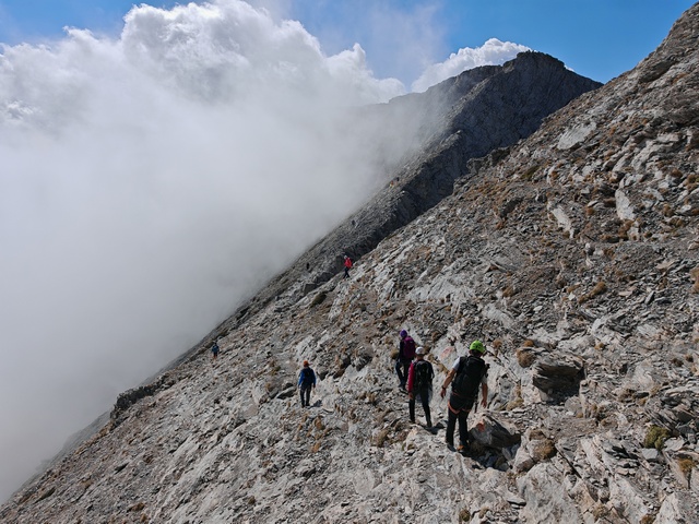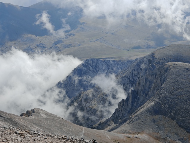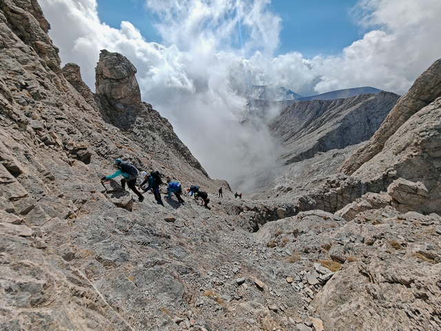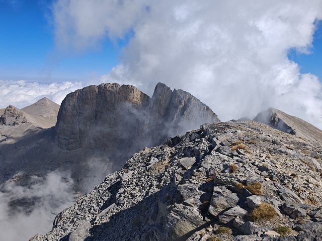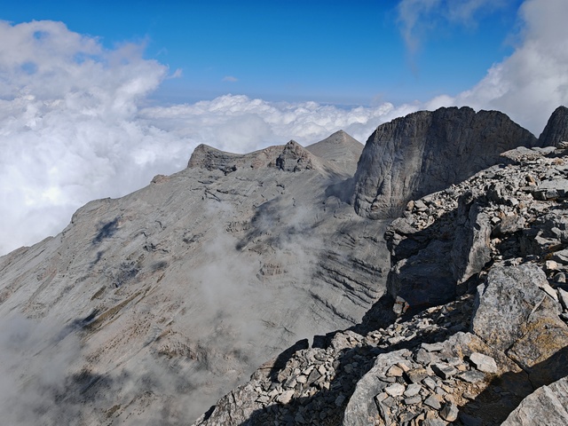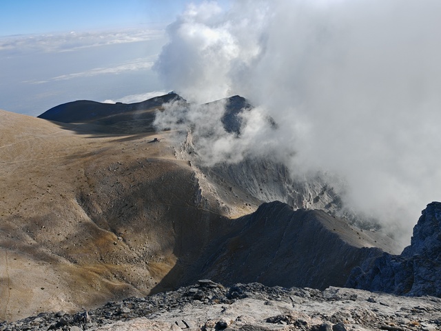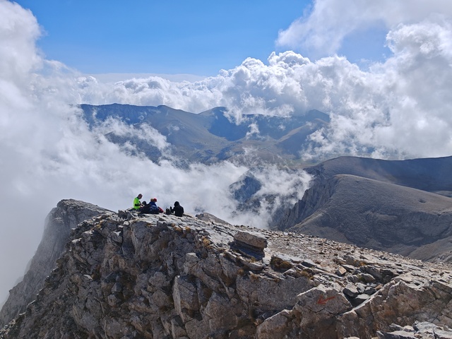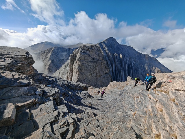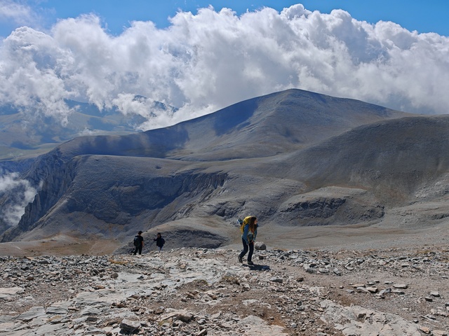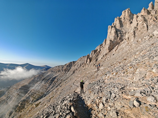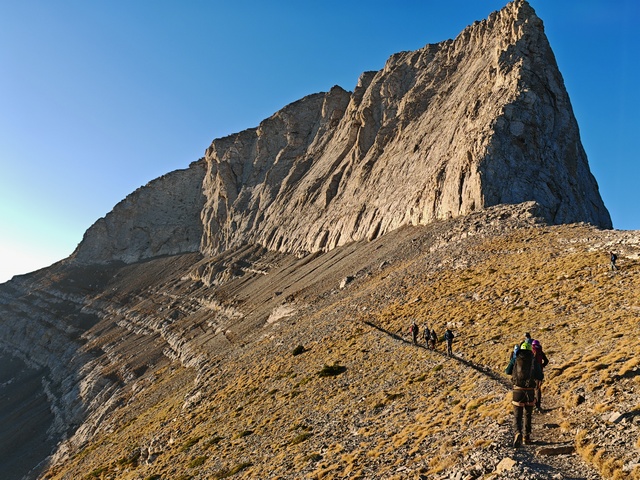 • Petak 16.10: Polazak iz doma u 07:00h. Staza nas vodi preko vrha Skourta (2476 m) i dalje preko prevoja Giosou sve do Platoa Muza. Napravićemo pauzu u domu Giosos Apostolides na Platou Muza, a ko bude želeo može se popeti na obližnje vrhove Profitis Ilias (2788 m) i Toumpa (2801 m). Nakon pauze, dalje nastavljamo ka “Zevsovom prestolu” vrhu Stefani. Na raskrsnici ka vrhu Stefani ćemo se podeliti u dve grupe: grupa A koja nastavlja zahtevnijom/tehničkom stazom preko vrhova Stefani (2911 m) i Mytikas (2917 m) do vrha Skala (2882 m) i grupa B koja nastavlja lakšom stazom/predelom Zonaria koja prati izohipsu ispod vrhova i zaobilazi ih. Obe grupe se ponovo spajaju na vrhu Skala (2882 m), a dalje zajedno širokom grebenskom stazom idemo do vrha Skolio (2905 m). U zavisnosti od prolaznog vremena, na vrhu Skolio ćemo odlučiti da li se direktno spuštamo ka domu Spilios Agapitos ili ćemo nastaviti dalje grebenom preko vrhova Agios Antonios (2816 m) i Stavraities (2616 m) i nakon toga spustimo u dom. Smeštanje u domu Spilios Agapitos, večera i noćenje. Statistika dana, grupa A: 15 km, 1300 m uspona, 1200 m spusta